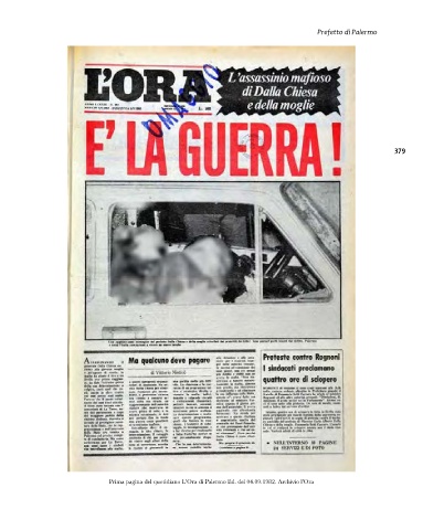 Prefetto di Palermo 379 Prima pagina del quotidiano L'Ora di Palermo Ed. del 04.09.1982. Archivio l'Ora