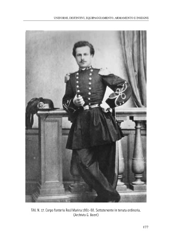 uniformi, distintivi, equipaggiamento, armamento e insegne TAV. N. 17. Corpo fanteria Real Marina 1861-68. Sottotenente in tenuta ordinaria. (Archivio G. Boeri) 177