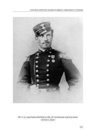 uniformi, distintivi, equipaggiamento, armamento e insegne TAV. N. 23. Corpo fanteria Real Marina 1861-68. Sottotenente in piccola tenuta. (Archivio G. Boeri) 193