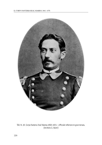IL CORPO FANTERIA REAL MARINA 1861- 1878 TAV. N. 28. Corpo fanteria Real Marina 1868-1873 – Ufficiale inferiore in gran tenuta. (Archivio G. Boeri) 220