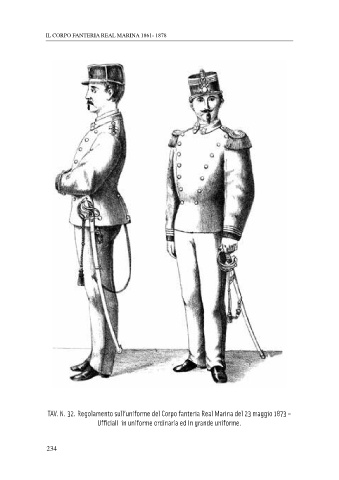IL CORPO FANTERIA REAL MARINA 1861- 1878 TAV. N. 32. Regolamento sull’uniforme del Corpo fanteria Real Marina del 23 maggio 1873 – Ufficiali in uniforme ordinaria ed in grande uniforme. 234