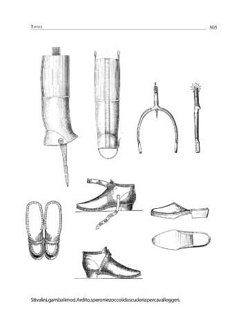 Tavole 305 Stivalini, gambali mod. Ardito, speroni e zoccoli da scuderia per cavalleggeri.