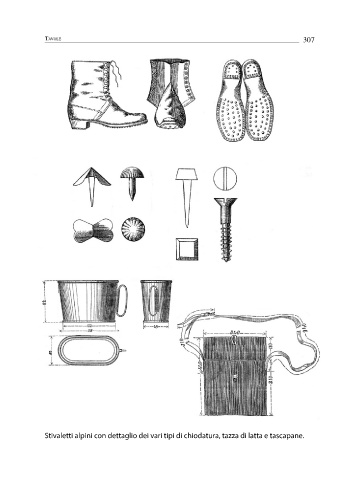 Tavole 307 Stivaletti alpini con dettaglio dei vari tipi di chiodatura, tazza di latta e tascapane.