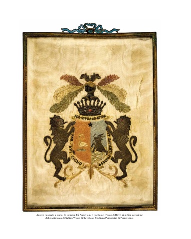 Arazzo ricamato a mano: lo stemma dei Parravicini e quello dei Thaon di Revel riuniti in occasione