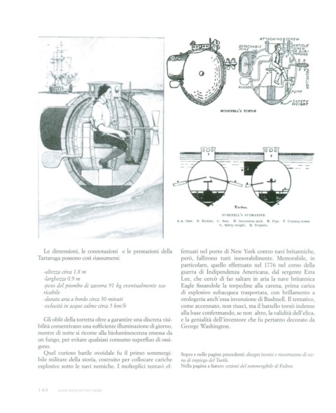 esplosive sotto le navi nemiche. I molteplici tentavi ef- Nella pagina a fianco: sezioni del sommergibile di Fulton.
