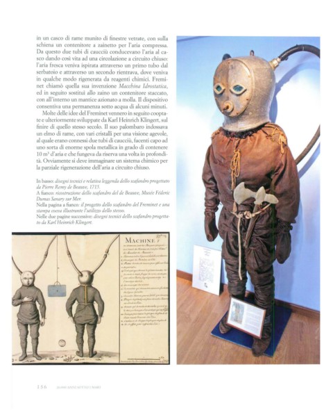 Nella pagina a fianco: il progetto dello scafandro del Freminet e una