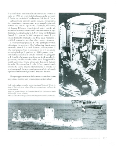 Nella pagina a fìanco: in alto, sezione tecnica del batiscafo Trieste; in